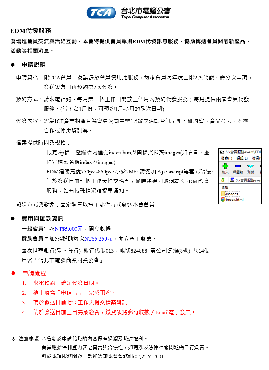一、蒐集目的及類別 為提供活動各項通知服務、報名資料確認、寄送本會或產業相關活動訊息及本會內部管理使用之蒐集目的,而須獲取您下列個人資料類別: 姓名、職稱、聯絡電話、E-mail。
