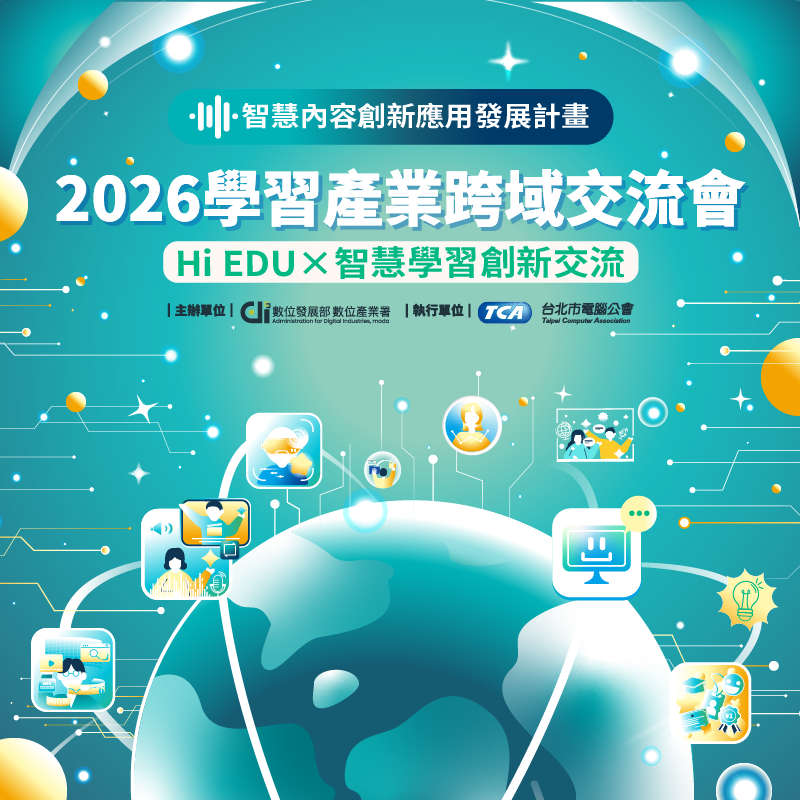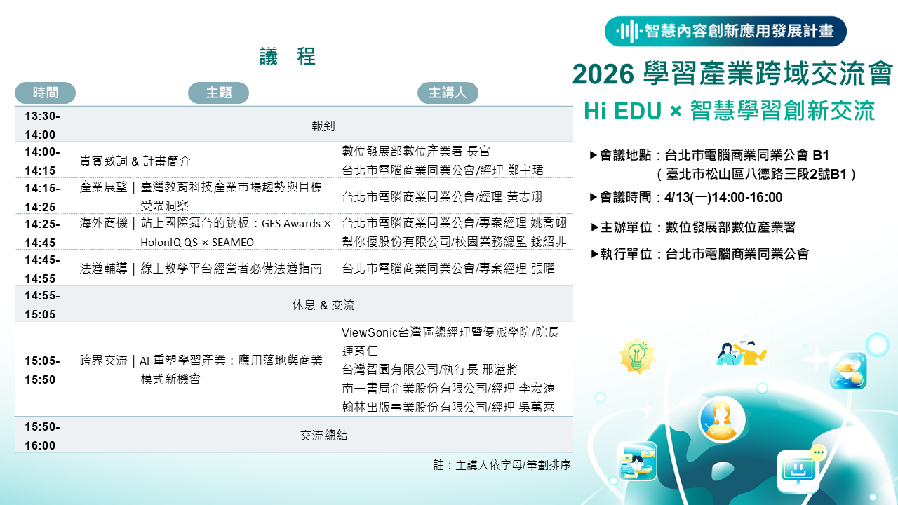 執行數位發展部數位產業署「智慧內容創新應用發展計畫」,為推動學習產業創新發展與跨域合作交流,4/13(一)14:00-16:00於台北市電腦商業同業公會 B1辦理「2026學習產業跨域交流會」,分享產業最新發展趨勢、海外商機及創新服務模式,協助業者掌握趨勢,促進異業結盟與合作媒合,期待打造更多交流、合作與共創的機會,活動資訊如下: