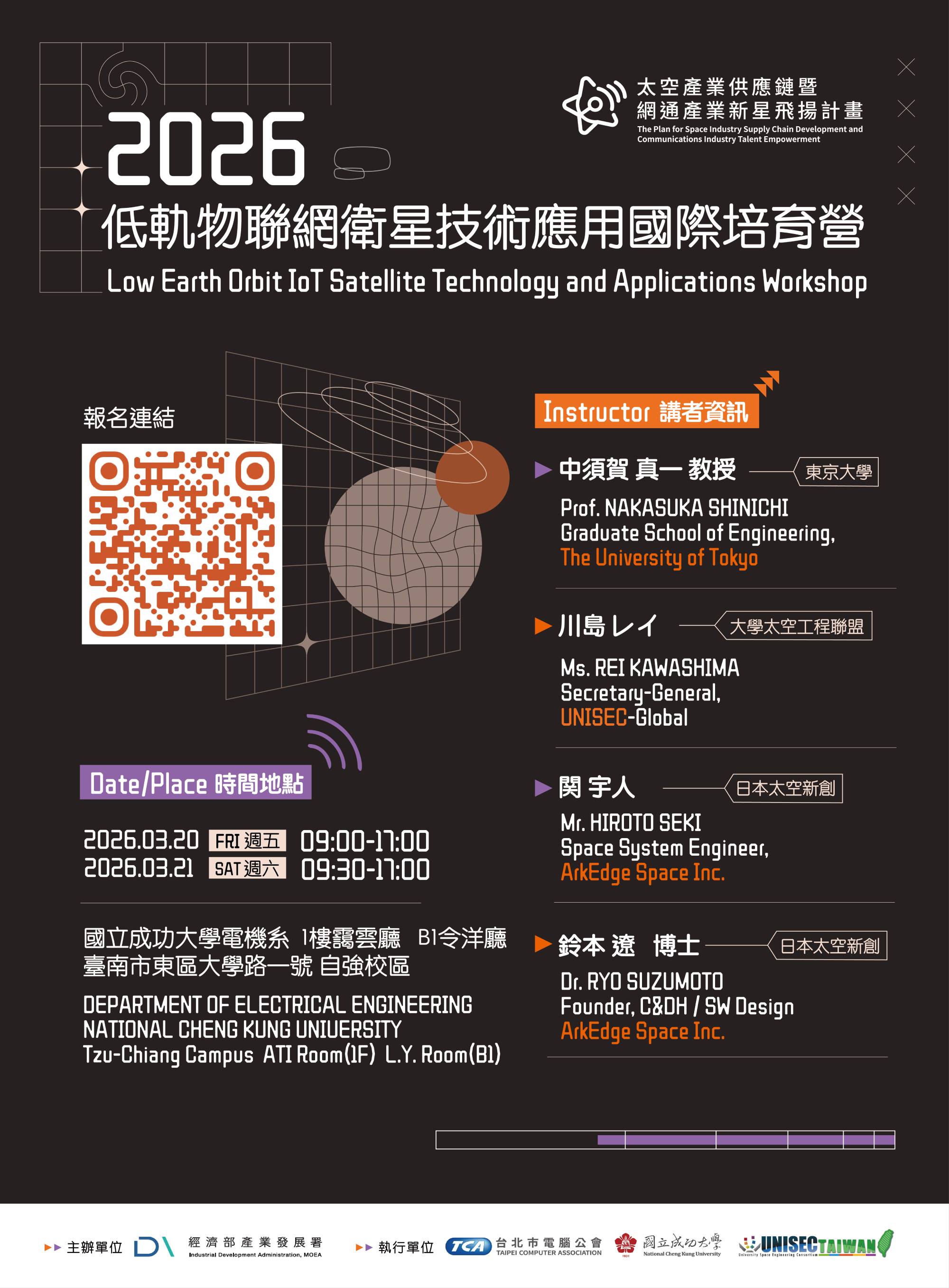 This two-day workshop is designed to help participants gain key knowledge and practical insights into the development of Low Earth Orbit (LEO) satellites through intensive courses and international exchange. This workshop will be held on March 20–21 at National Cheng Kung University. Distinguished speakers include Prof. Shinichi Nakasuka from The University of Tokyo, Ms. Rei Kawashima, Secretary-General of UNISEC-Global, and Mr. Hiroto Seki and Mr. Ryo Suzumoto from the Japanese startup ArkEdge Space, who will share their expertise on LEO IoT satellite technologies and applications.